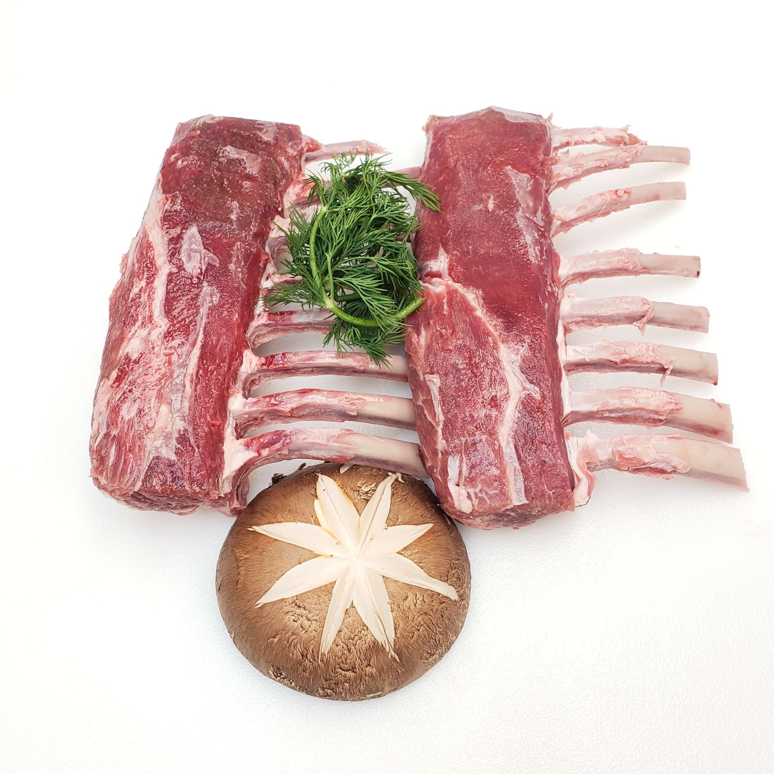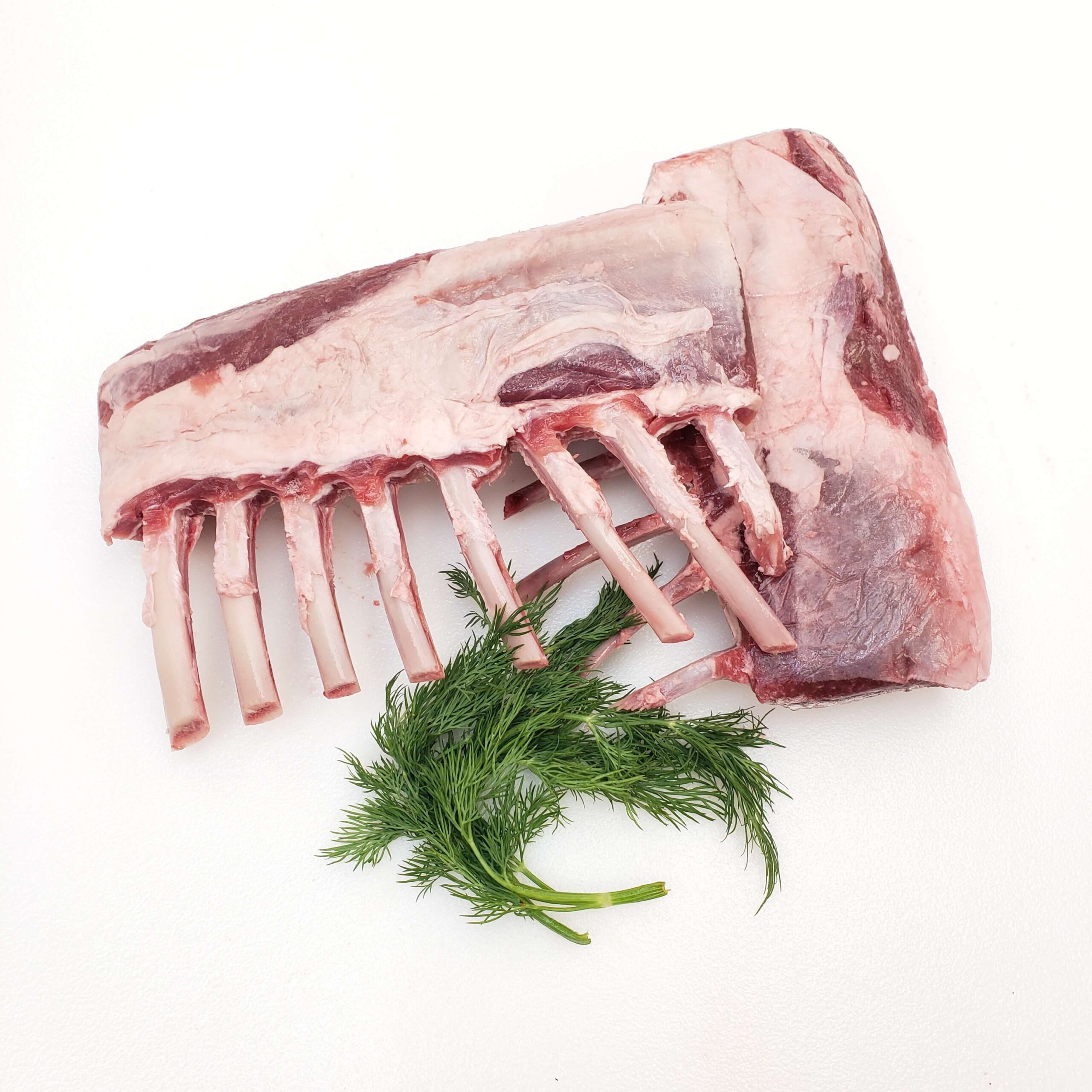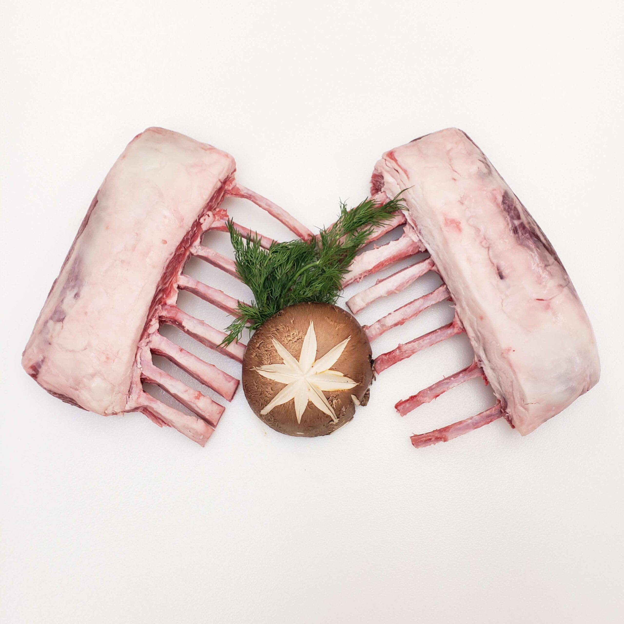 Two 8 Rib racks, each weighing between 1 3/4 – 2 lbs. each. By the term “Frenched Rack” we mean that we trim the meat from the end of the bones, resulting in clean bones.