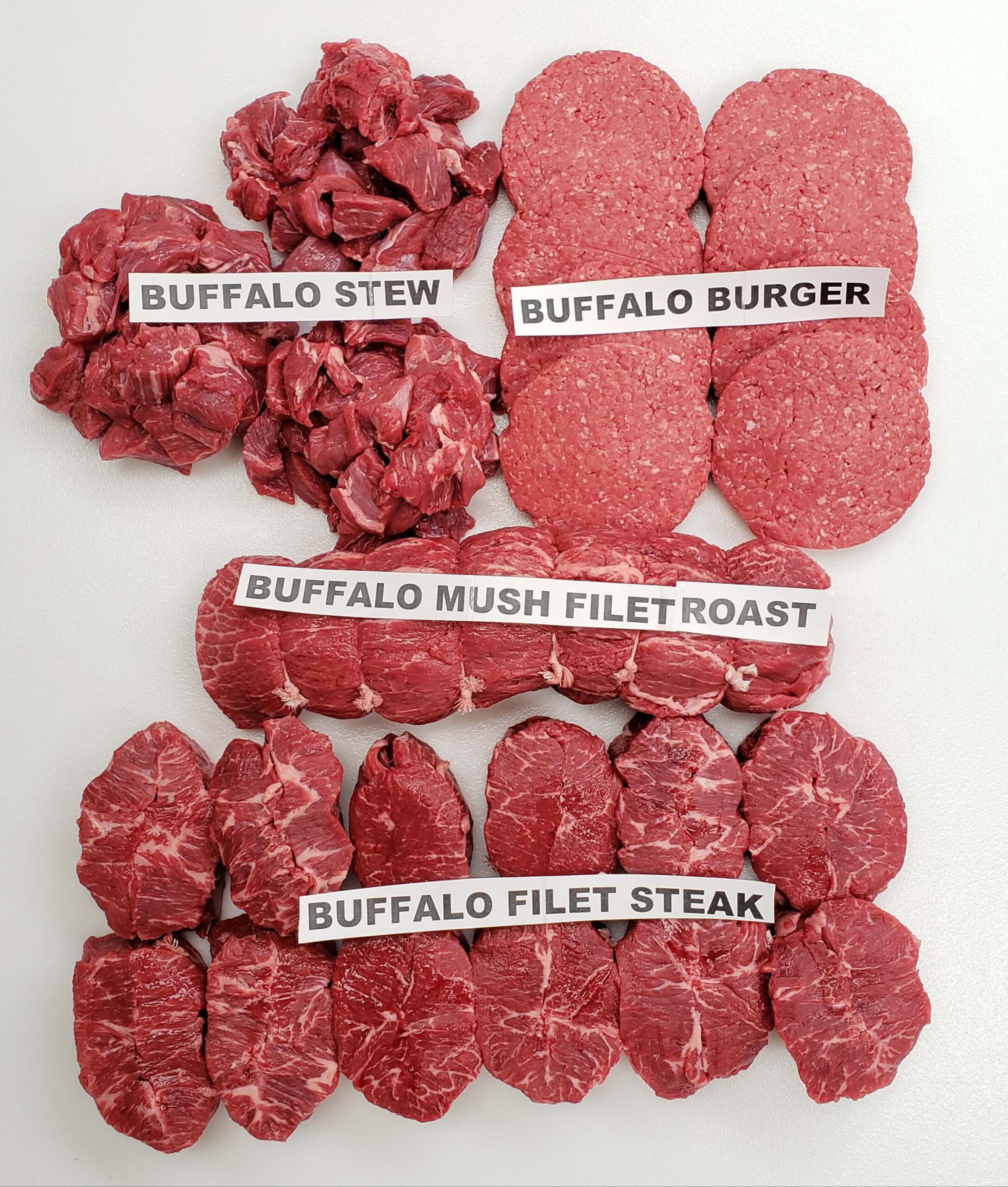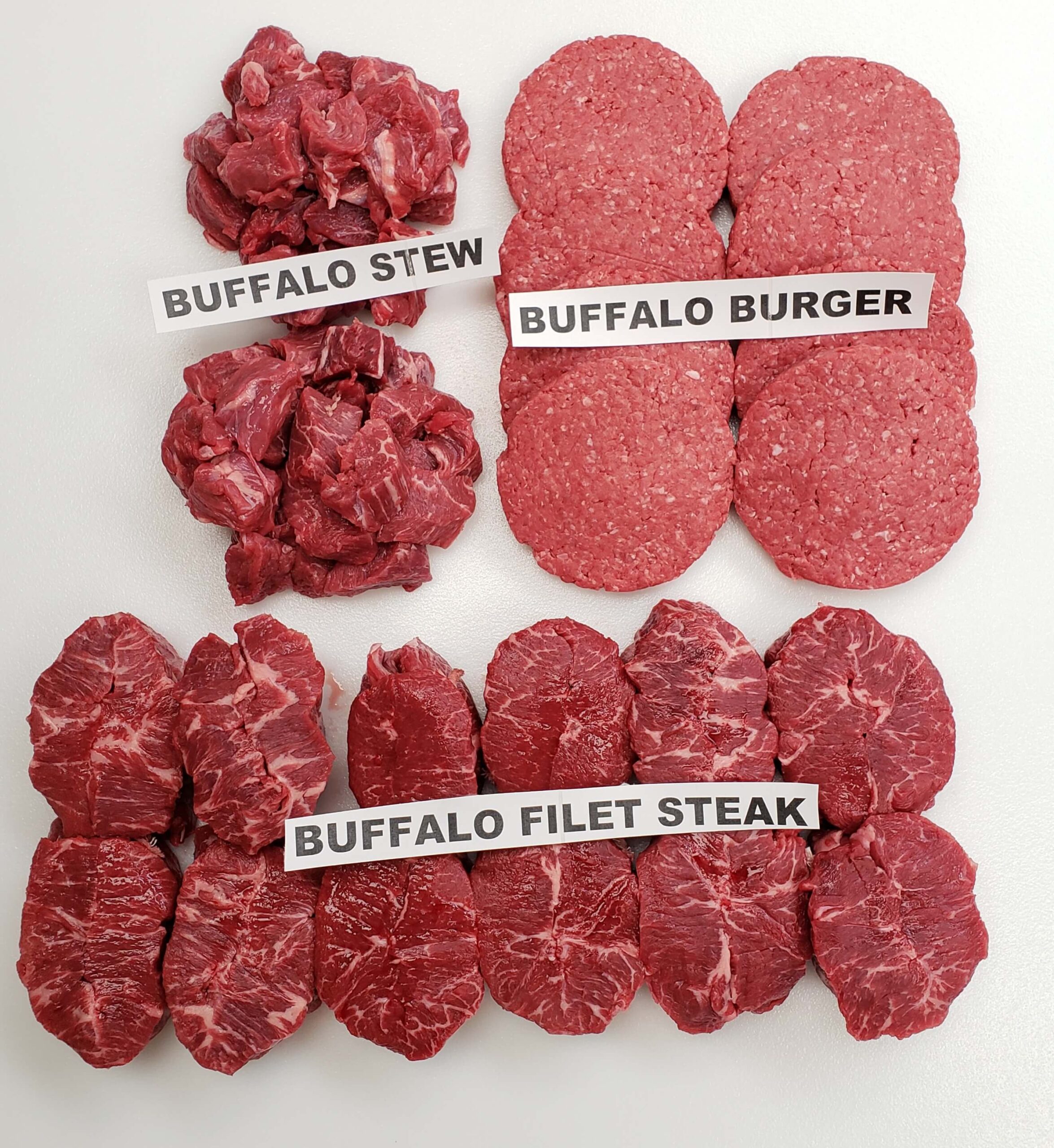 8 buffalo burgers, 12 buffalo filet steaks 7-8 oz., 2 lbs. buffalo stew