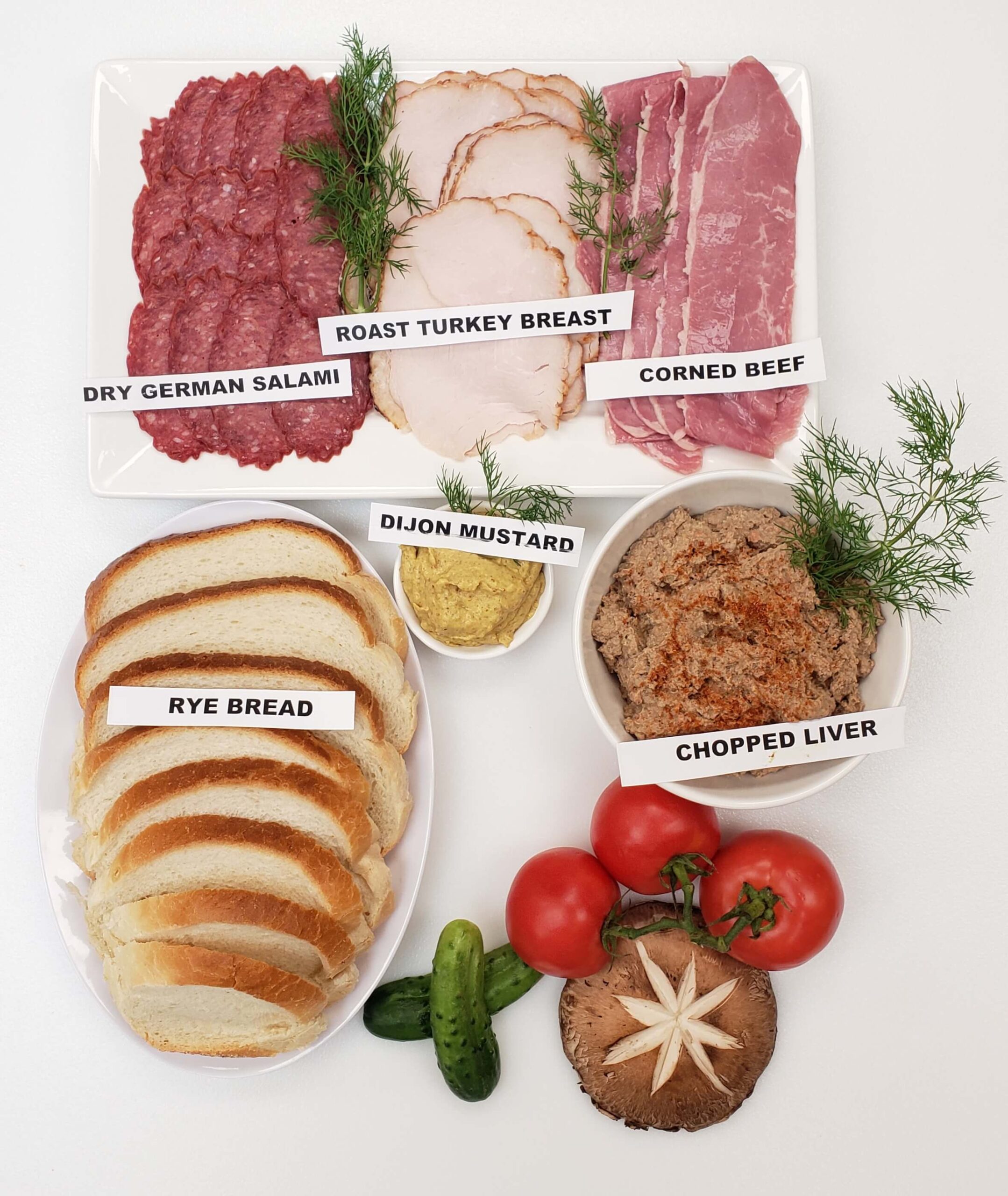 1 salami, 1 lb. corned beef, 1 lb. organic roast turkey breast, 1 lb. chopped liver, 1 large rye bread, 1/2 lb. gourmet mustard