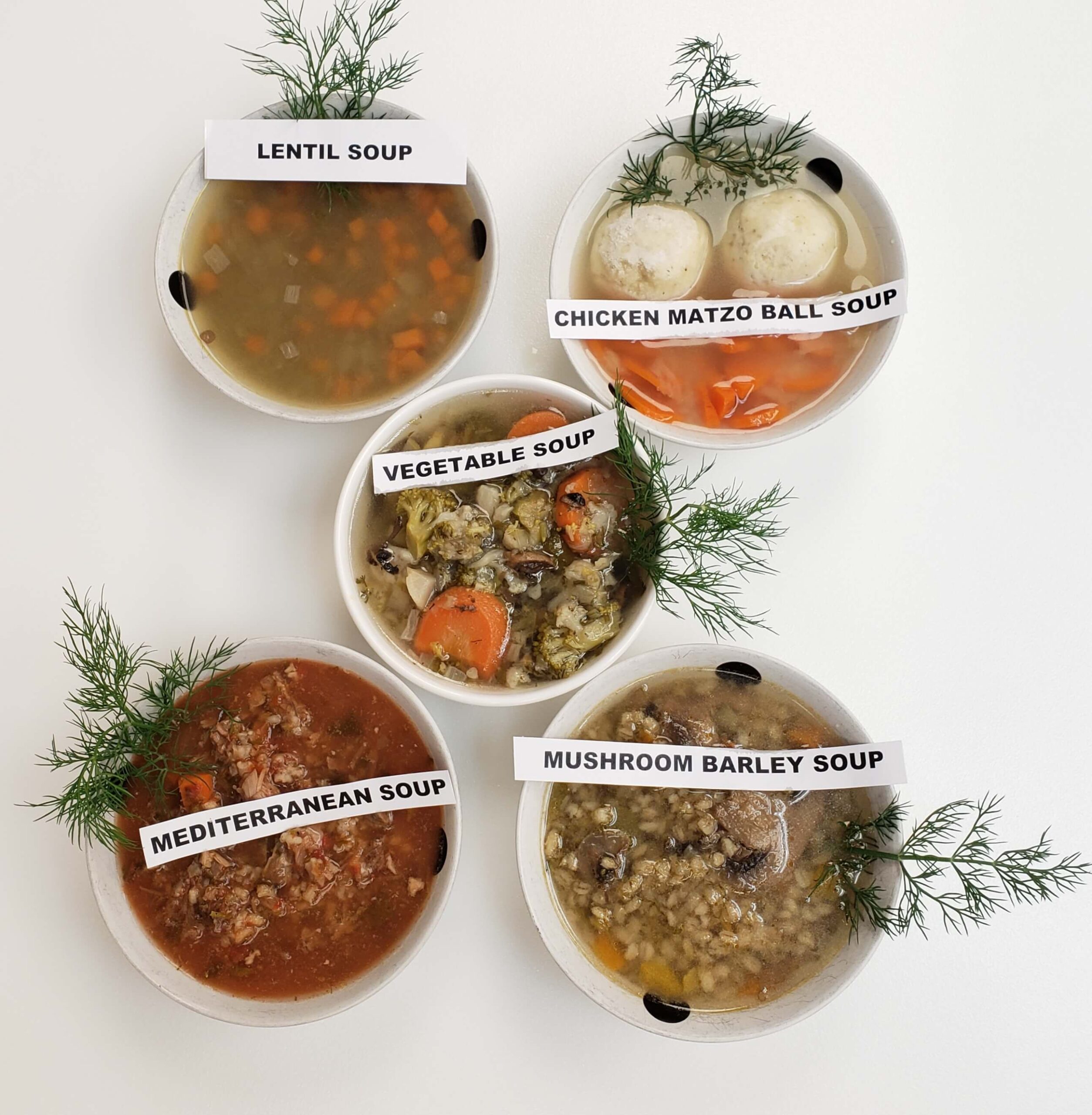 1 quart chicken matzo ball soup, 1 quart mushroom barley soup, 1 quart vegetable soup, 1 quart Mediterranean soup and 1 quart garlic soup
