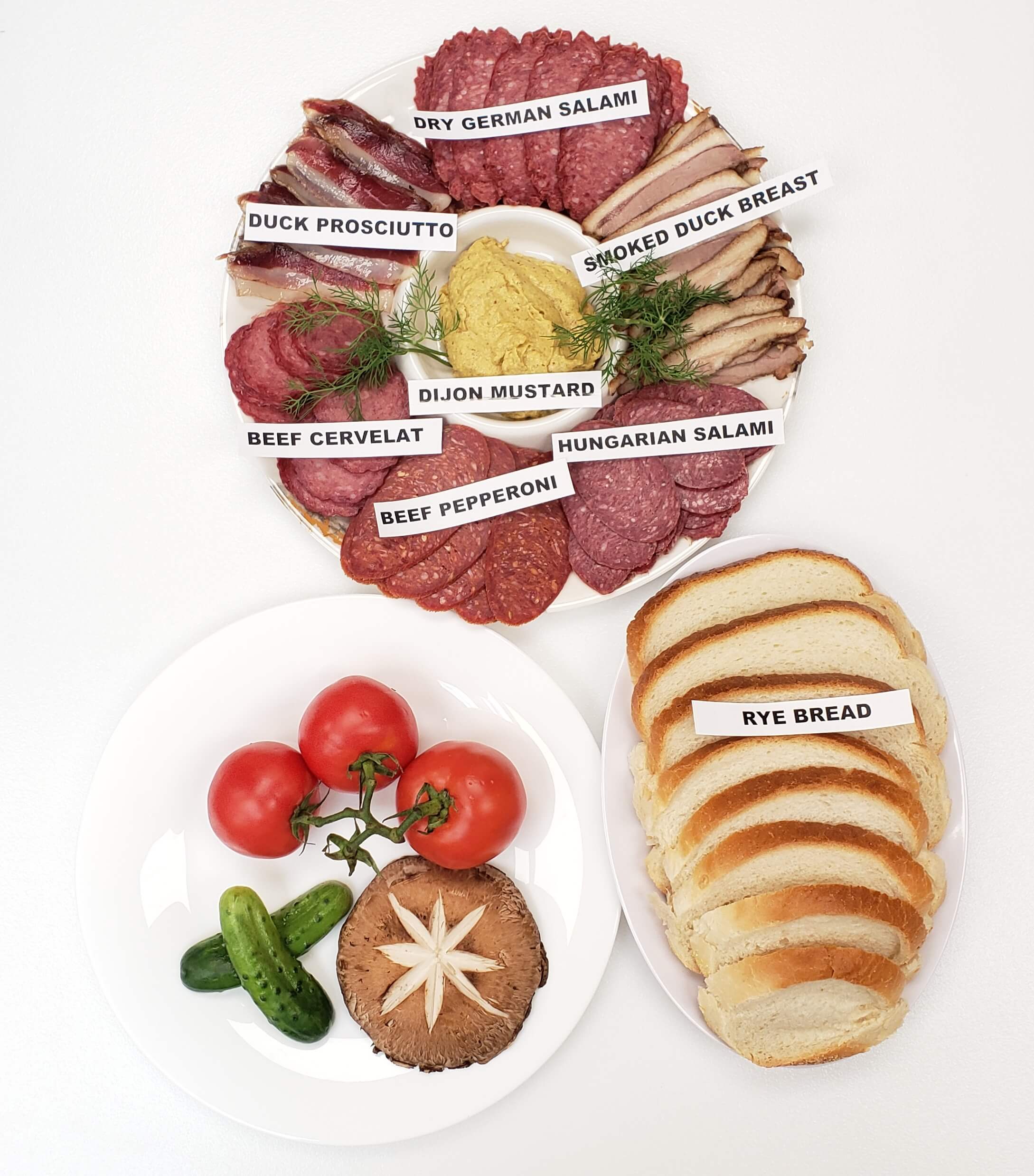 1/2 lb of pepperoni, 1/2 lb of cervalet, 1/2 lb of Hungarian salami, 1/2 lb. of extra dry German salami, 1/4 lb of our world-famous duck prosciutto and 1/4 lb of our smoked duck breast. Includes Dijon mustard and rye bread