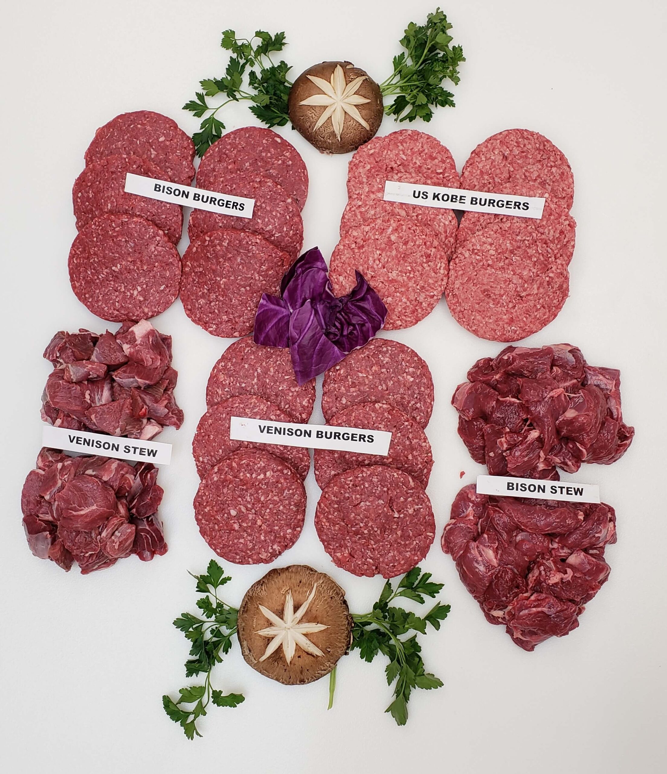 6, 6 oz bison burgers, 2 lbs bison stew, 6, 6 oz venison burgers, 2 lbs venison stew, 6, 6 oz USA Kobe burgers, 8 oz Aaron’s special sauce