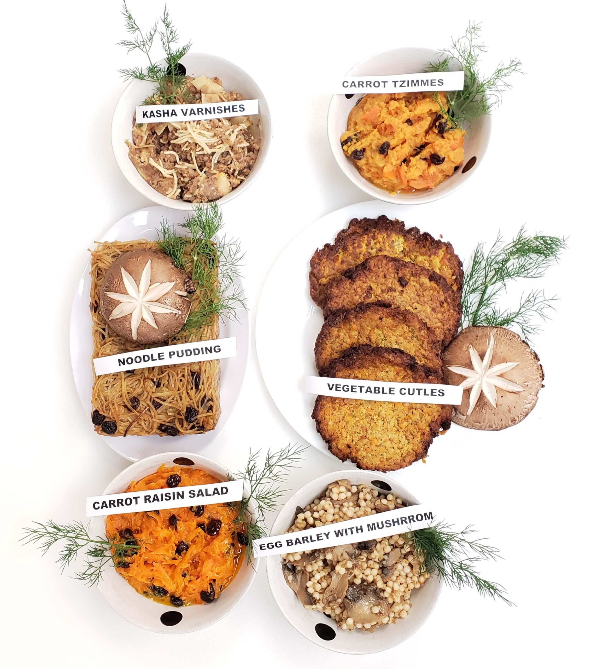 1 lb. tzimmes, 1 lb. noodle pudding, 4 vegetable cutlets, 1 lb. carrot raisin salad, 1 lb. kasha varnishes, 1 lb. egg barley and mushrooms