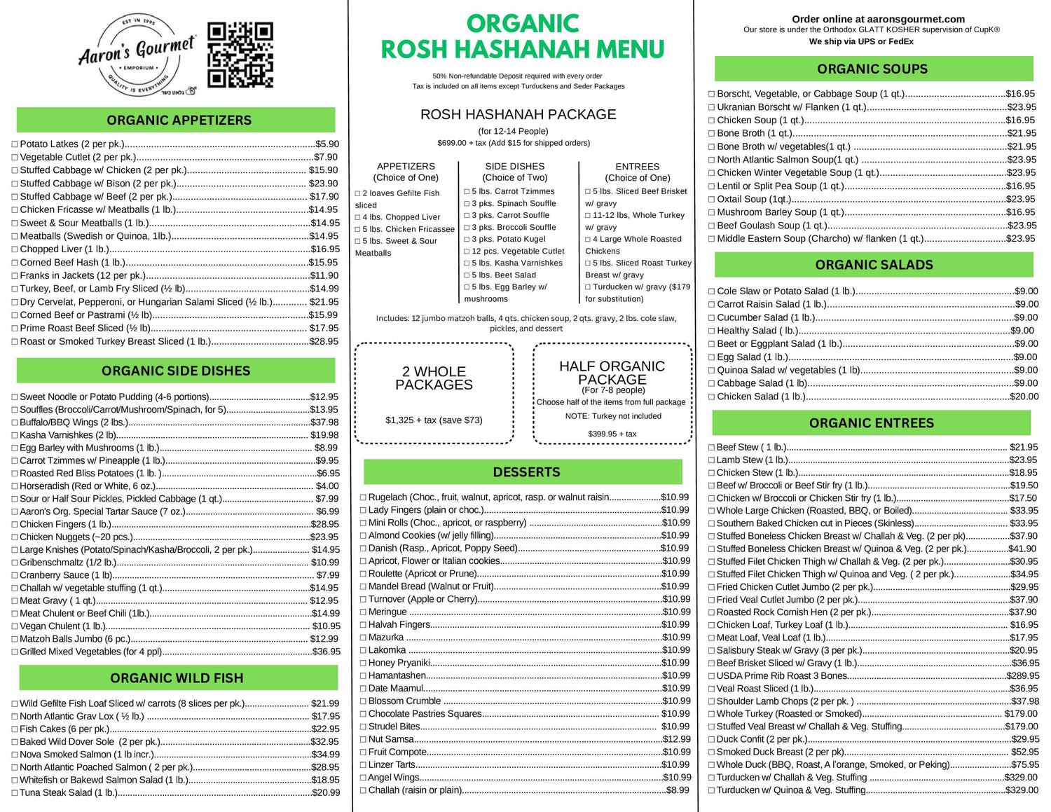 Aaron's Gourmet offers a Rosh Hashanah Menu of organic, GLATT KOSHER certified delicacies, including traditional appetizers, meat and fish entrees, and Jewish pastries. Vegetarian and gluten-free options are available, ensuring a variety to suit all dietary preferences.